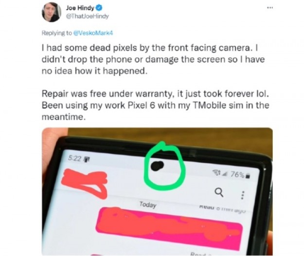 Повідомляється, що биті пікселі з'являються у верхній частині дисплея навколо отвору, в якому розташована фронтальна камера смартфона. Зазначається, що згодом окремі чорні точки перетворюються на плями, через що починає здаватися, що отвір для камери не є круглим.