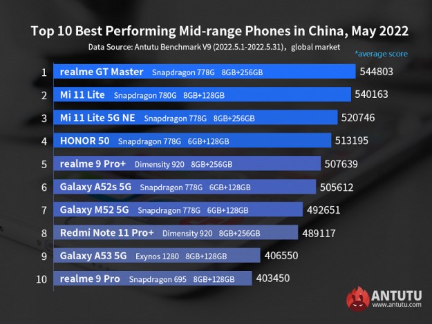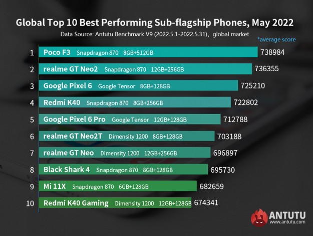 Команда бенчмарку AnTuTu опублікувала рейтинг смартфонів Android середнього та субфлагманського сегменту за травень 2022 року для міжнародного ринку. Рейтинг субфлагманів суттєво змінився порівняно з квітнем. Перше місце посів Poco F3, який у квітні займав восьме місце. А друге місце посів смартфон Realme GT Neo 2, опустившись із першого. На третьому місці опинився Google Pixel 6, який раніше був на другому місці.