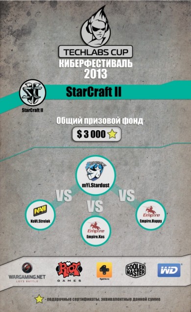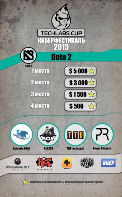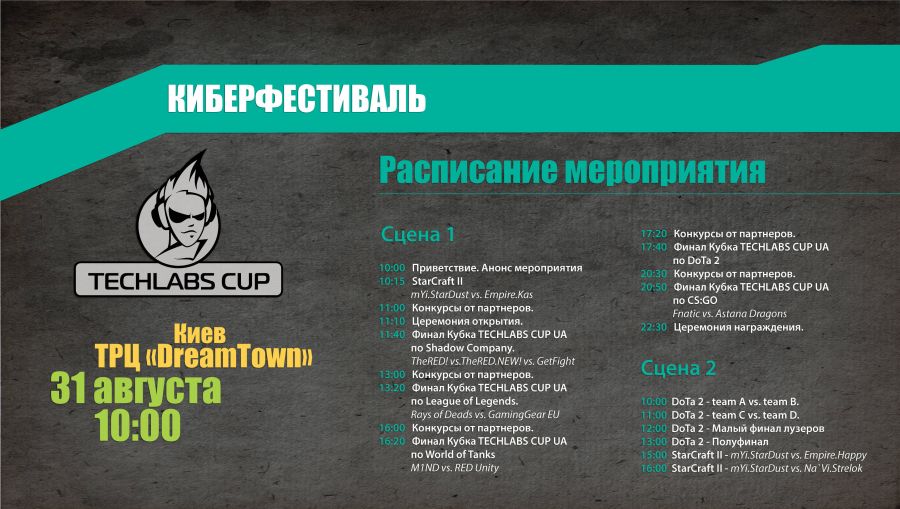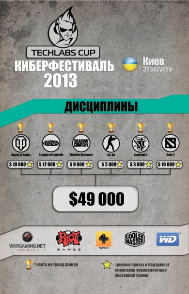 Украинский финал киберфестиваля TECHLABS CUP UA 2013 состоится в эту субботу31 августа пройдет третий в этом году финал международного киберфестиваля TECHLABS CUP 2013. В субботу Киев примет любителей, профессионалов и болельщиков компьютерных игр в ТРЦ «DreamTown1». В этот день на площадке фестиваля соберутся лучшие киберспортсмены Европы и Азии. Игроки будут сражаться за звание сильнейшего по дисциплинам World of Tanks, Shadow Company, League of Legends, Dota 2, Counter-Strike: Global Offensive и StarCraft II. Общий призовой фонд, за который будут бороться участники, составит $49000*. Старт мероприятия в 10.00. Вход свободный. Расписание мероприятия: Площадь ледового катка ТРЦ «DreamTown1» станет местом проведения TECHLABS CUP UA 2013. На 1193 квадратных метрах будет оборудована сцена для итоговых баталий киберспортсменов. С большим удобством наблюдать за этими боями зрителям предлагается на огромной видеостенке в 27 метров, состоящей из пяти экранов. Комментировать происходящие баталии будут профессиональные стримеры из Украины, Беларуси, России и Литвы. В финале турнира по Dota 2 встретятся четыре команды. Участники, прошедшие квалификационный отбор:Cascade.1xBet и RoX.KiS – сойдутся в финальной схватке с неоднократными чемпионами киберспортивных турниров. Приглашенные команды TTD (ex. iCCup) и Power Rangers составят конкуренцию победителямотборочных соревнований в битве за $10000*. В битве по Shadow Company примут участие команды из России HELPERS, GetFight.org и TheRED, которые в открытой квалификации оказались лучшими. Общий призовой фонд в данной номинации составит $9000*. "Игровая платформа 4game рада представлять Shadow Company в качестве киберспортивной дисциплины на TECHLABS CUP UA 2013. От этапа к этапу фестиваль становится все масштабнее, а игра Shadow Company все популярней. Команда 4game рассчитывает на дальнейшее плодотворное сотрудничество с TECHLABS CUP" - прокомментировала Саодат Ахмедходжаева, менеджер по развитию Shadow Company. Одно из самых захватывающих и увлекательных шоу нас ждет по дисциплине StarCraft II. Против чемпиона DreamHack Summer 2013 mYinsanity.StarDust, приглашенного из Южной Кореи, выступят сильнейшие игроки СНГ: NaVi.Strelok, Empire.Kas и Empire.Happy. Каждый из участников сразится со знаменитым на весь мир игроком за $1000*. Киевский финал киберфестиваля состоится и по новой для TECHLABS CUP дисциплине. По League of Legendsдве команды получили квоты на киевский финал TECHLABS CUP 2013: GamingGear EU и Rays of Deadsотправятся в Киев, чтобы сразится за $9000*. Нас также ожидают сражения по популярной игре World of Tanks. Команды RED Unity и M1ND оказались лучшими в квалификационной гонке из почти 340. Призовой фонд, за который в финале будут сражаться участники, составит $10000*. Лучший игрок турнира получит эксклюзивное издание книги «Танки» в кожаном переплете от интернет-магазина podarochnieknigi.ru. Одним из ожидаемых событий на TECHLABS CUP UA 2013 будет финальная битва по Counter Strike: Global Offensive. Команда Astana Dragons, прошедшая в финал по результатам открытой квалификации, будет противостоять в финале сильнейшей команде мира, приглашенной в Киев организаторами, Fnatic. Команды сойдутся в финальной схватке за $4500*. Всех гостей киберфестиваля ожидает незабываемое шоу, поскольку организаторы подготовили огромнейшую сцену с видео стеной FULL HD, длиной 27 метров! На экранах будут одновременно транслироваться игровые процессы, видеоролики и многое другое. Зрелище будет дополнено специальным освещением и звуковым оформлением, которые никого не оставят равнодушным. Помимо зрелища,