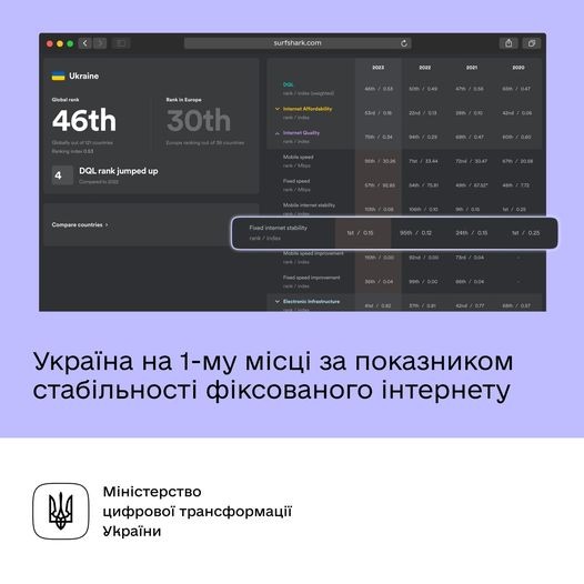 Про це йдеться в дослідженні Digital Quality of Life Index за 2023 рік. Це міжнародний рейтинг, який оцінює якість цифрових послуг в країнах за п’ятьма показниками, зокрема й інтернету.