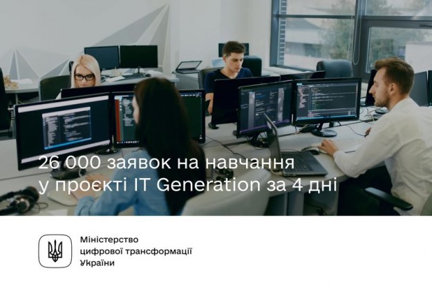 Українці подали 26 000 заявок на навчання у проєкті ІТ GenerationТака кількість за 4 дні від старту прийому заявок. Проєкт дає можливість українцям, які не мають досвіду в ІТ, за 2-6 місяців безоплатно здобути освіту у сфері ІТ. Це спеціальності, що можна опанувати без попередньої підготовки. Як результат — ринок отримує нові кадри, а українці — затребувану професію.