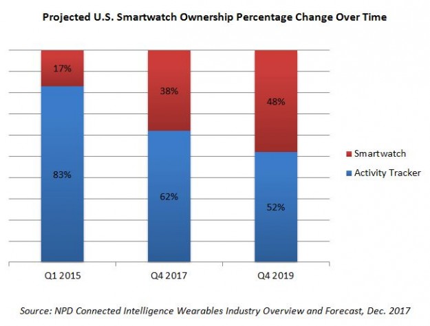 Процесс ускорился с выходом модели Apple Watch 3 и снижением цен на модели Apple Watch и Apple Watch 2. Ожидается, что по итогам текущего квартала умные часы займут 38% рынка, а их основные конкуренты на рынке носимых устройств, браслеты — 62%. Для сравнения: в первом квартале 2015 года доля умных часов была равна 17%, браслетов — 83%. Аналитики прогнозируют, что тенденция сохранится, так что в четвертом квартале 2019 года доли умных часов и браслетов составят 48% и 52% соответственно.