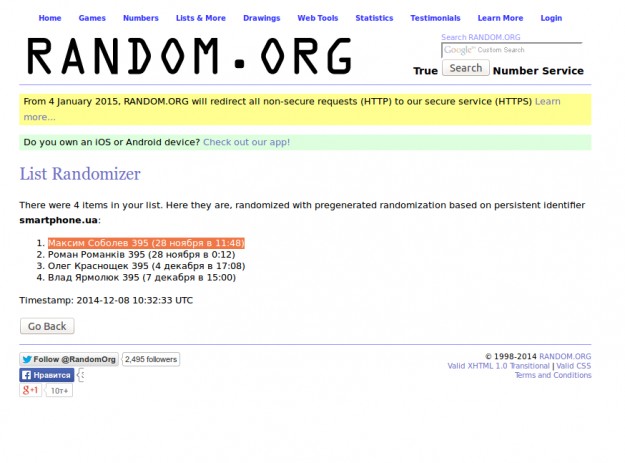 Правильный ответ на конкурсное задание дали сразу четыре участника: Роман Романків, Максим Соболев, Олег Краснощек и Влад Ярмолюк. Среди участников, правильно ответивших на конкурсный вопрос, победителя выбирал сервис http://www.random.org/lists/. Его случайный выбор пал на Максима Соболева. Правильный ответ на конкурсное задание - 395 грамм. Видео с правильным ответом: https://www.youtube.com/watch?v=lbKGcQs5EWg Видео розыгрыша - https://www.youtube.com/watch?v=qkGqKRfOqAw Поздравляем и благодарим Всех за участие! С победителем, выигравшим флешку GOODRAM TWIN 64GB USB 3.0 OTG, редакция Smartphone.ua свяжется в ближайшие два дня. Джерело: SmartPhone.ua Обговорення новиниВалерий Иванов: У Вас ребята чашка универсальная.То в одном конкурсе ее вес составляет 337 грамм,то в другом 392 гр.,куда захочу туда и поверчу. Попередні новини