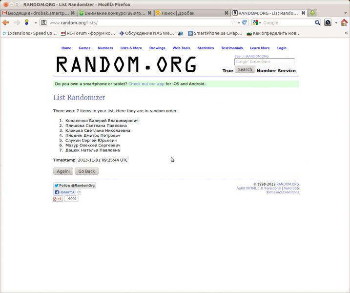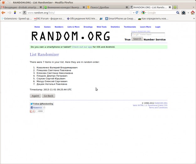 Универсальные чехлы-книжки Drobak 7`` нашли своих владельцев!Мы рады сообщить Вам, что победителями конкурса от портала Smartphone.ua и компании Drobak, главные призы которого пять универсальных чехлов-книжек Drobak 7'', стали Коваленко Валерий Владимирович, Плишова Светлана Павловна, Клокова Светлана Николаевна, Плоднік Дмитро Петрович и Слукин Сергей Юрьевич. В конкурсе приняло участие 132 человека. К сожалению, правильных ответов было всего семь. Победителей выбирал сервис http://www.random.org/lists/. Его случайный выбор пал на: Правильные ответы: 1-в; 2-в, 3-а; 4-а; 5-г, 6-б, 7-в Благодарим всех Вас за участие! Джерело: SmartPhone.ua Обговорення новиниМарк: Черт) в одном вопросе ошибку допустил Саша: 6-б) защиты торцов корпуса, экрана и задней панели при падении - и как же это правильный ответ? Разве при падении экран защищается бампером? От царапин - да, защищает за счет выступа. Все ответы на 6 вопрос не совсем корректны и б) не лучше подходит, чем в) Саша: правильно было бы - защита торцов при падении, а экрана и задней панели - от царапин, но такого варианта не было предоставлено Валерий: Вообще то правильный ответ: а) защиты торцов корпуса при падении.Не может бампер защитить экран от падения к примеру на угол кирпича,так же и заднюю панель не защитит.Ответ у Вас господа НЕВЕРНЫЙ 100%. 1. Коваленко Валерий: Вчера получил по "Новій пошті" этот приз - чехол-книжку drobak 7" - СПАСИБО ! - Мне очень кстати - 14.10.2013 я как раз приобрел 7"планшет. Качество исполнения хорошее, надеюсь минимум годика-полтора будет отлично служить (!). Еще раз моя благодорность порталу smartphone.ua и организаторам, а всем учасникам и читателям - всего наилучшего и Удачи! Попередні новини