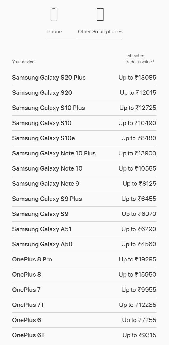 Унизительные расценки на смартфоны Samsung по Trade-in от AppleВзаимный троллинг в среде крупных компаний сегодня не редкость. Впрочем, вчерашнюю попытку Samsung подшутить над Apple едва ли можно назвать удачной. Но куда забавнее выглядит безмолвная страничка на сайте Apple, включающая перечень смартфонов, пригодных для обмена по программе Trade In при покупке новых iPhone. Так, за сдачу флагманских Galaxy S10, S20 и S20+ в Индии купертиновцы готовы предложить смешные скидки до 12-13 тыс. рупий ($170-180), а флагманы 2019 года в лице Galaxy S9 и Note 9 и вовсе помогут сбить цену на iPhone лишь на 6-8 тыс. рупий.