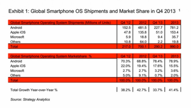 В активе ОС Android за 2013 год 79% всех смартфоновАналитическая компания Strategy Analytics опубликовала отчет о распределении рынка мобильных устройств по состоянию на 2013 год. Согласно ему, в 2013-м было отгружено рекордные 781.2 млн Android-смартфонов, 78,9% от общего количества проданных в прошлом году девайсов (990 млн), что на 10,1% больше, нежели в 2012-м.