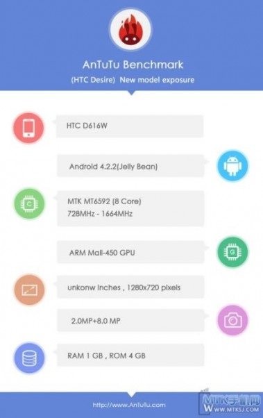 В AnTuTu дебютировал 8-ядерный смартфон HTC D616WВ базе данных популярного бенчмарка AnTuTu был замечен не представленный еще официально смартфон HTC D616W, главной особенностью которого является однокристальная система от Mediatek с восемью процессорными ядрами на борту.