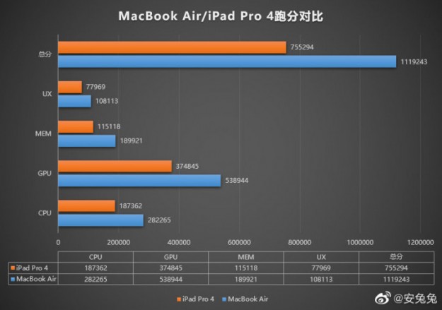 В AnTuTu появился первый в истории миллионерБенчмарк AnTuTu протестировал новейший MacBook на чипсете M1, созданным на ARM-архитектуре, что и дает возможность прогнать его в синтетических тестах. Проходил испытание MacBook Air на M1, а отображается он как iPad 8.6 на iOS 14.2 (особенность ненастроенного под данный тип устройств бенчмарка). Но самое важное здесь то, что впервые в истории сервиса девайсу удалось набрать более 1 000 000 попугаев. Более того, MacBook Air установил планку на уровне 1 119 243 баллов, что почти более чем на 50% выше, чем у актуального лидера iOS-чартов и почти вдвое превышает показатели Android-фаворитов (прямое сравнение некорректно в обоих случаях). Главное достоинство чипсета - графическая подсистема, которая дает почти половину конечного результата. Графики и вот это все можете посмотреть ниже.