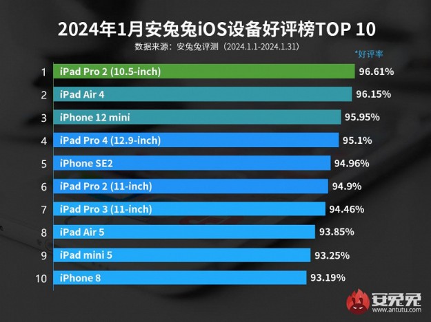 В AnTuTu розповіли, якими пристроями Apple користувачі задоволені найбільшеРозробники бенчмарка AnTuTu опублікували актуалізований рейтинг пристроїв Apple, якими найбільше задоволені користувачі. Перелік за січень 2024 року очолив iPad Pro 2 з діагоналлю 10,5 дюйма. Цим пристроєм задоволені 96,69% користувачів.