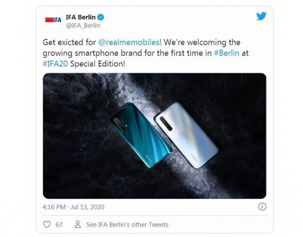 В этом году Realme впервые примет участие в IFAВ мае стало известно, что популярная выставка технологий IFA, которая проводится ежегодно в начале сентября в Берлине, в этом году из-за пандемии COVID-19 будет проходить не так, как обычно. Чтобы снизить риск заражения COVID-19, организаторы решили, что принять участие в выставке смогут только представители бизнеса. Посещение выступлений и экспозиции широкой публикой не предусмотрено. Мероприятие, намеченное на период с 3 по 5 сентября, будет состоять из четырех отдельных частей, каждую из которых смогут посетить не более 1000 человек в день.