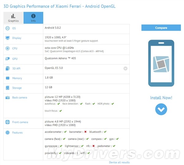 Данные тестера информирую о наличии на борту Xiaomi Ferrari 4.9-дюймового дисплея с разрешением 1920х1080 пикселей, 64-битного 8-ядерного процессора серии Snapdragon 615 от Qualcomm с графикой Adreno 405, 2 ГБ оперативной памяти и 16 ГБ встроенной. Кроме того, девайс получил 5Мп фронтальную камеру и 13Мп основную с системой автофокусировки и LED-вспышкой, обе с возможностью записи Full HD видео. Работает тестовый экземпляр под управлением операционной системы Android 5.0 Lollipop. Среди беспроводных модулей связи на его борту присутствуют Wi-Fi, Bluetooth и GPS. И пока что это все, что известно о новинке китайского производителя. Ни дата анонса, ни цена Xiaomi Ferrari пока не сообщаются. Джерело: SmartPhone.ua Обговорення новини