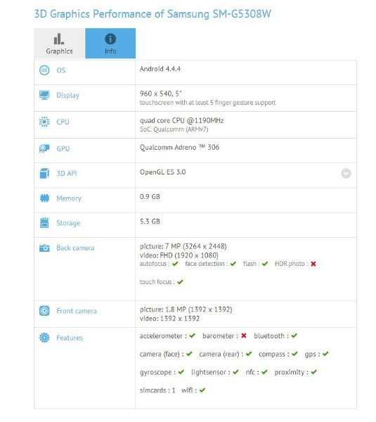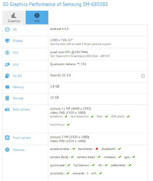 Первая из новинок будет оснащена 5-дюймовым дисплеем с разрешением 540x960 точек, 64-битным 4-ядерным процессором серии Snapdragon 410 от Qualcomm с частотой 1.2 ГГц и графикой Adreno 306, 1 ГБ оперативной памяти и 8 ГБ встроенной, а также 2Мп фронтальной камерой и 8Мп основной, беспроводными модулями Wi-Fi, Bluetooth и GPS. В качестве операционной системы указана Android 4.4.4 KitKat. Samsung SM-G8508S, как стало известно, получит от производителя HD-экран диагональю 4.7 дюйма, 4-ядерный процессор серии Snapdragon 800 от Qualcomm, правда, указанная в тестере тактовая частота в 2.45 ГГц соответствует более продвинутому Snapdragon 801. Среди других спецификаций новинки называют 2ГБ ОЗУ и 16 ГБ ПЗУ, 2Мп фронтальную камеру и 12/13Мп основную, модули Bluetooth, Wi-Fi, GPS и NFC, а также Android 4.4.4 KitKat "из коробки".