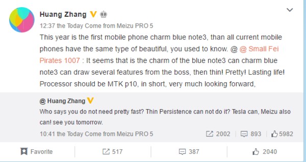 В Meizu рассекретили спецификации смартфона Blue Charm Note 3Генеральный директор Meizu Хуан Чжан на своей странице в китайском сервисе микроблогов Weibo поделился информацией о готовящихся к анонсу мобильных новинках компании. Так, по словам источника, первым смартфоном, выпущенном компанией в 2016 году, станет фаблет Blue Charm Note 3. Он получит 8-ядерный процессор MediaTek Helio P10 с тактовой частотой 2 ГГц и графическим чипом Mali-T860 MP2, симметричный порт USB Type C, сканер отпечатков пальцев, а также аккумулятор увеличенной емкости с поддержкой технологии быстрой зарядки mCharge.