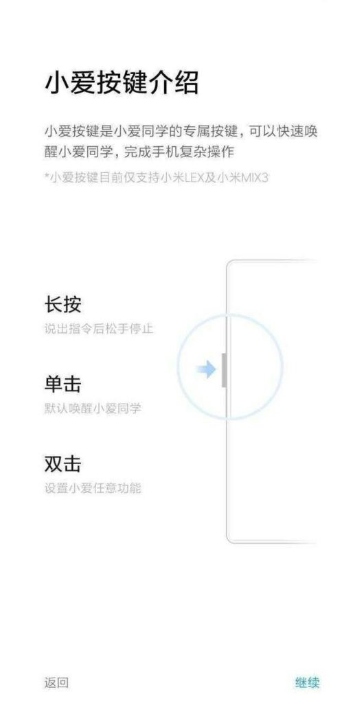 По данным источника, смартфоны Xiaomi Mi Mix 3 и Mi LEX будут оснащены специальной кнопкой для запуска фирменного цифрового помощника Xiao AI. Одним нажатием на эту кнопку, расположенную на левой грани, можно активировать смартфон. На длительное нажатие можно продиктовать голосовую команду или задать вопрос помощнику. Двойное нажатие можно настроить по своему вкусу.