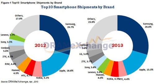 В первом квартале треть мировых поставок смартфонов оказалось за SamsungОб этом стало известно благодаря подсчетам аналитиков DRAMeXchange итогов первого квартала 2013 года. Согласно их данным, за прошлый квартал на мировой рынок было отгружено порядка 216,4 млн. смартфонов. Из них почти 30% (29,6%) благодаря стараниям южнокорейского производителя.