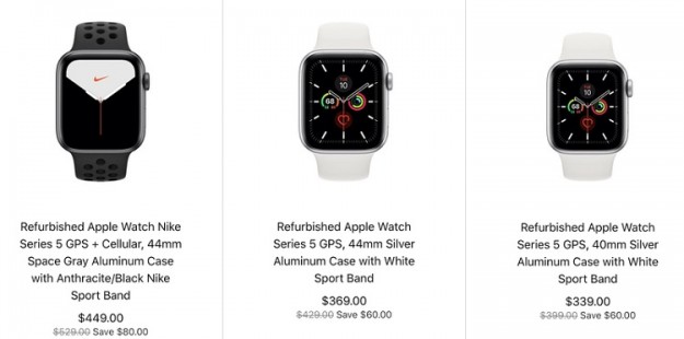 Apple предлагает достаточно широкий выбор восстановленных моделей часов. Доступны варианты с корпусами из алюминия или нержавеющей стали, с поддержкой GPS и сотовой связи, с разными диагоналями дисплеев. К примеру, восстановленные Apple Watch Series 5 с поддержкой сотовой связи и GPS в корпусе из нержавеющей стали с белым спортивным ремешком обойдутся покупателю в $639, что на $110 ниже стоимости новых часов.