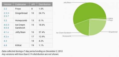 В рейтинге Google появился Android 4.4 KitKat с 1,1%По итогам прошедшего месяца операционная система Android Jelly Bean получила 54,5%, и на данный момент лидирует среди других версий оси. Кроме нее, в троице лидеров также Android 2.3 - 24,1% плюс Android 4.0 с 18,6% рынка.