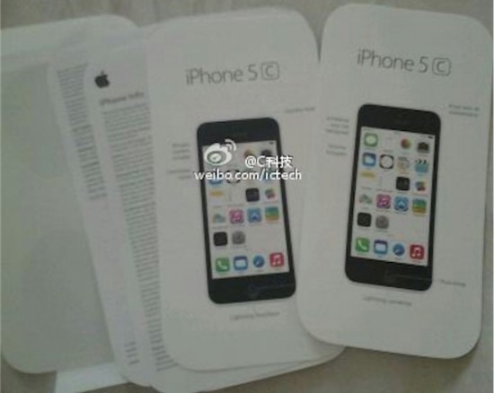 Коробка iPhone 5C во многом напоминает упаковку плеера iPod touch. С фото видно, что обои рабочего стола соответствуют цвету самого устройства, а именно розовые. А вот на руководстве пользователя изображен iPhone 5C в белом цвете, снимки смартфона в таком цветовом решении также уже не раз появлялись в СМИ.