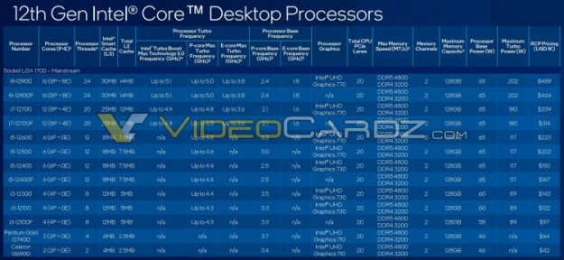 Самым дорогим из новых чипов станет Core i9-12900, который будет стоить $489. Это также будет самый мощный среди новых процессоров. Его теплопакет в режиме Turbo будет достигать 202 Вт. Самой доступной среди всех новинок станет Celeron G6900 с двумя ядрами и TDP 46 Вт, чья цена начинается с $42.