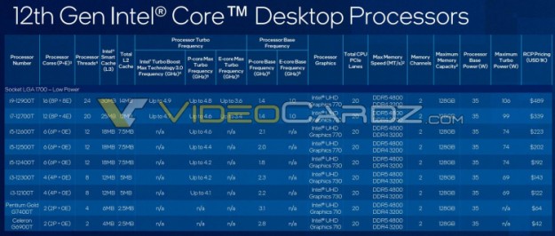 Intel также представит настольные процессоры серии Т с базовым TDP 35 Вт. Все эти чипы получат встроенную графику. Самым дорогим будет Core i9-12900T, который оценивается в $489. Самой бюджетной среди новинок станет Celeron G6900T стоимостью $42.