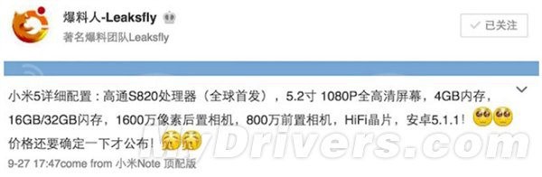 В Сеть утекли новые подробности о флагмане Xiaomi Mi5Пользователь Leaksfly на своей странице в китайском сервисе микроблогов Weibo сообщил технические характеристики будущего флагмана компании Xiaomi - Mi5.