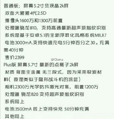 В Сеть утекли подробные спецификации смартфонов Xiaomi Mi5 и Mi5 PlusКитайские источники впервые опубликовали детальные технические характеристики готовящихся к анонсу флагманских смартфонов Xiaomi Mi5 и Mi5 Plus. По словам инсайдеров, обе новинки производителя получат металлический корпус, сканер отпечатков пальцев и экран из гнутого 2.5D стекла с разрешением 2560х1440 пикселей, прикрытый защитным стеклом Gorilla Glass 4. Диагональ дисплея Mi5 составит 5.2 дюйма, а Mi5 Plus — 5.7 дюйма. Работать устройства будут на прошивке MIUI v7, основанной на операционной системе Android 5.1 Lollipop.