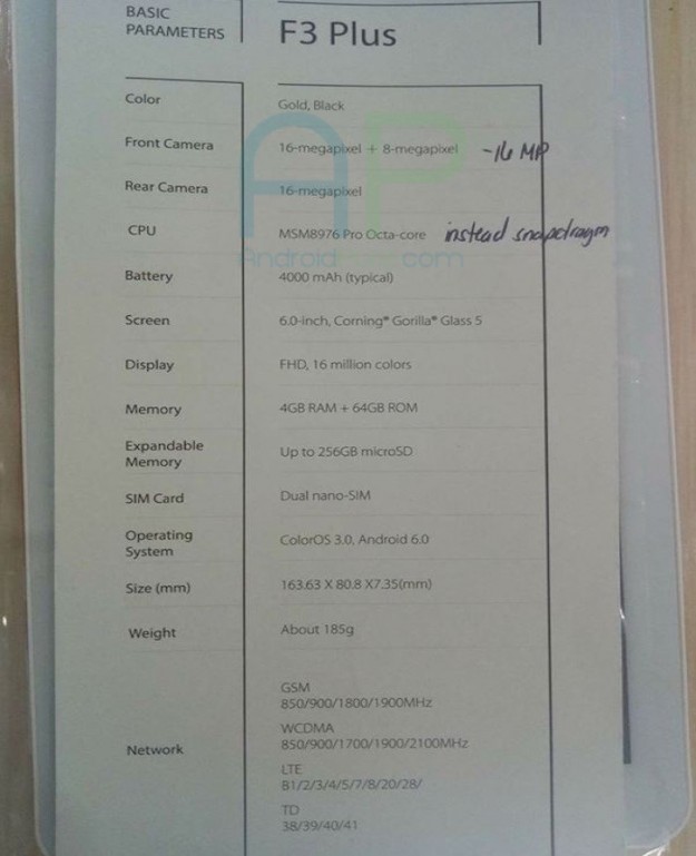 Среди прочих спецификаций старшей из будущих новинок называют процессор серии Snapdragon 653 от Qualcomm, 4 ГБ оперативной памяти и 64 ГБ встроенной, расширяемой с помощью карт памяти microSD максимальным объемом до 256 ГБ. В корпус F3 Plus размерами 163.63x80.8x7.35 мм и весом 185 грамм будет установлен также аккумулятор на 4000 мАч, два слота для SIM-карт с поддержкой 4G LTE сетей и основной фотомодуль на 16Мп.