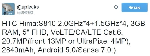 В Сети появились новые подробности о флагмане HTC HimaИзвестный своими публикациями о неанонсированных устройствах twitter-аккаунт @UpLeaks рассказал о спецификациях не представленного еще официально флагманского смартфона тайваньской компании HTC, известного под кодовым названием "Hima". По словам источника, новинка получит от производителя 5-дюймовый дисплей с разрешением 1920х1080 пикселей, 64-битный 8-ядерный процессор серии Snapdragon 810 от Qualcomm с графикой Adreno 430, 3 ГБ оперативной памяти. В наличии аппарата будет также аккумулятор емкостью 2840 мАч, поддержка 4G LTE-сетей и технологии VoLTE (Voice over LTE), а также 20.7Мп основная камера.