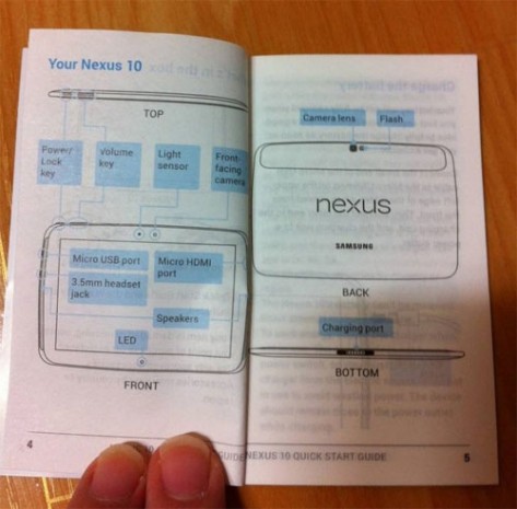 В Сети появилось фото инструкции пользователя для Google Nexus 10На этой иллюстрации хотя и нет фотографии самого планшета, но несложно заметить, что имеющаяся схема напоминает Samsung Galaxy Note 10.1. Судя по документации, в грядущем устройстве будет установлено для камеры: основная, с LED-вспышкой, а также фронтальная. Кроме того, новинка получит порт mini-HDMI, а также разъем 3,5 мм, а немного выше дисплея аппарата предусмотрен датчик освещенности.