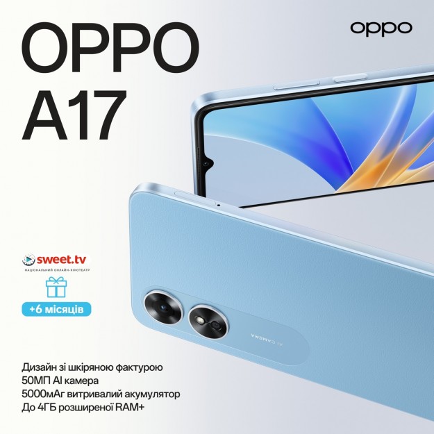 В Україні представлено новий OPPO A17 з 50-мегапіксельною камерою та акумулятором на 5000 мАгOPPO представляє в Україні найновіше доповнення до лінійки смартфонів A серії — OPPO A17, оснащений 50-мегапіксельною камерою та довготривалим акумулятором ємністю 5000 мАг.