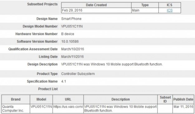 VAIO готовит к анонсу новый смартфон на ОС Windows 10В документах сертификационной организации Bluetooth SIG был замечен новый смартфон под брендом Vaio, работающий на базе операционной системы Windows 10. По данным Bluetooth SIG, устройство с модельным номером VPU051C11N, производить которое будет тайваньская ODM-компания Quanta Computer, получит встроенный модуль Bluetooth 4.1.