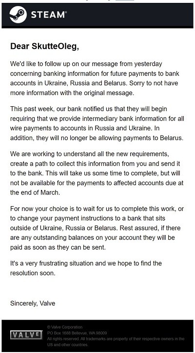 Напомним, в первоначальном электронном письме для создателей игр, затронутых ситуацией, Valve сообщила, что «в связи с текущей обстановкой» не может отправить банковские платежи в перечисленные страны.