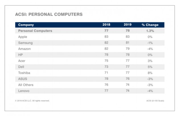 Нужно признать, что Apple теперь предлагает iPad практически для всех из-за доступного ценника на самую простую модель и набор ее базовых возможностей. Новое исследование показывает, что, независимо от выбранной модели бренда из Купертино, вы, скорее всего, будете очень довольны покупкой. Согласно информации на базе американского индекса удовлетворенности клиентов (ACSI), который опросил более 12500 человек в период с сентября 2018 года по август 2019 года, Apple вновь лидирует на рынке планшетов по уровню удовлетворенности клиентов. Основной момент, который смущает владельцев - максимальное звучание ограничено, но качество высокое. Конечно, для вечеринок его мало, но для этого можно найти прокат звука на концерт у специализирующейся на этом компании. В сочетании с популярностью настольных компьютеров Mac и ноутбуков MacBook Apple была поставлена оценка удовлетворенности 83/100 для всего сегмента персональных компьютеров. Эта оценка находится на уровне рейтинга компании в 2018 году и ставит его на два балла впереди Samsung, занявшей второе место. В этом году корейский бренд упал на одну позицию до 81/100.
