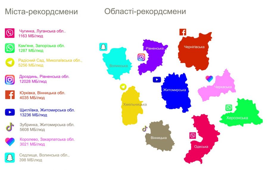 Отметим, что по сравнению с аналогичным рейтингом прошлого года показатели среднего месячного удельного объема трафика на одного пользователя (МБ/чел) несколько уменьшились, что обусловлено «размытием» статистики через общий рост количества пользователей всех указанных сервисов. Синий цвет, с наибольшим трафиком Facebook (1037 МБ/чел), получила Черниговская область. Ее соседи, Житомирская и Черкасская области получили соответственно красный и розовый цветовые коды, достигнув наибольших среди областей показателей среднего месячного удельного объема трафика в YouTube (3839 МБ/чел) и Likee (767 МБ/чел). Чемпионом по TikTok стала «черная» Винницкая область, которая продемонстрировала показатель трафика 2112 МБ/чел. Самый большой трафик Telegram (844 МБ/чел) создавали жители «голубой» Хмельницкой области. Как и в прошлом году, фиолетовой и зеленой стали Одесская и Херсонская области с показателями Viber (118 МБ/чел) и Whatsapp (98 МБ/чел) соответственно. Самые активные пользователи Instagram до сих пор проживают в «вишневой» Ровенской области и создают трафик 2917 МБ/чел. В то же время наиболее активные пользователи сервиса Snapchat находятся в «желтой» Волынской области с показателем 46 МБ/чел – и здесь за год ничего не изменилось. Vodafone также выделил населенные пункты с наиболее активными пользователями этих же сервисов: