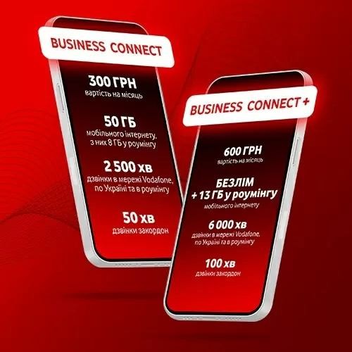Vodafone оголошує про випуск нової лінійки бізнес-тарифів Business Connect. У нових тарифах Vodafone запропонував своїм корпоративним клієнтам великі обсяги хвилин для дзвінків як всередині мережі, так і на інших операторів. Крім того, тарифи враховують збільшення потреб у користуванні мобільним інтернетом. Перевагою Business Connect є послуга «Роумінг як вдома», що дозволяє використовувати обраний тариф як в Україні, так і в роумінгу (на території 27 країн ЄС та Молдови) без будь-яких додаткових плат. Все, що необхідно для користування мобільним зв’язком під час робочих візитів, вже включено в тариф. Нова лінійка включає тарифи Vodafone Business Connect та Business Connect+. Business Connect: