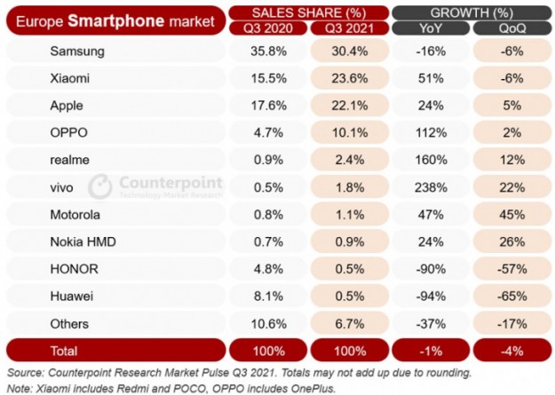 Вот это поворот! Масштабные перемены на рынке смартфонов в ЕвропеНедавно мы рассказали об итогах третьего квартала на глобальном рынке смартфонов, который не претерпел значимых перемен. Куда интереснее события разворачиваются на рынке Европы, который, согласно свежему отчёту Counterpoint Research, буквально наводнили китайские бренды. Так, рыночная доля OPPO возросла более, чем вдвое (с 4,7 до 10,1%), показав прирост 112%. Ещё удачнее оказалась Realme, прибавившая 160% (с 0,9% годом ранее до 2,4% сейчас), однако главным рекордсменом стала Vivo, годовой прирост которой составил 238%.