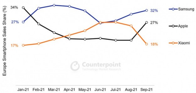 На графике тройки лидеров также можно заметить падение интереса у европейского покупателя к устройствам Xiaomi, который стабильно рос на протяжении первого полугодия. Одновременно с этим Samsung вышла из падения, восстановив позиции до весенних значений, а у Apple наблюдается традиционный всплеск, связанный с запуском новых iPhone.