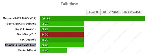 Такая автономность, как оказалось на практике, совпадает с возможностями Samsung Galaxy Nexus, Nokia Lumia 510, HTC Desire V и Samsung Captivate Glide.