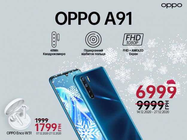 В этом году ОРРО AED Украина дарят праздничную скидку и на бестселлер ОРРО А91 — самый мощный и легкий смартфон из всей А серии. Возможности высокоскоростной оперативной памяти смартфона обеспечивают лучшую производительность, а 128 Гб встроенной предоставляют достаточно места для хранения нужных файлов. OPPO A91 оснащен технологией быстрой зарядки VOOC Flash Charge 3.0, а также аккумулятором 4025 мАч. 48 Мп Quad камера с комбинированной технологией «4-в-1 пикселе» позволяет создавать сверхчеткие фотографии с поразительной детализацией, в том числе в условиях слабого освещения. У вас есть отличная возможность приобрести ОРРО А91 по праздничной цене всего 6999 грн вместо 9999 грн с 14 по 27 декабря. Новое понимание звука с наушниками от ОРРО Новогодние скидки — отличная возможность наконец оценить профессиональное качество звука беспроводных TWS наушников от ОРРО. Бренд предлагает модели разных ценовых категорий: бюджетные ОРРО Enco W11, стильные ОРРО Enco W31, мощные ОРРО Enco W51.