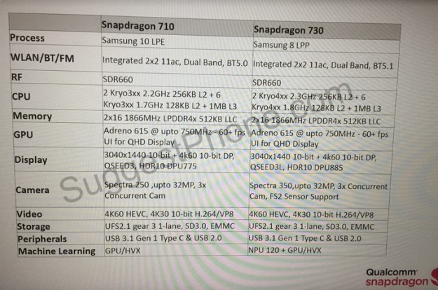 Итак, Snapdragon 710 станет восьмиядерным (Kryo 3xx) 10-нм решением с 2 проиизводительными ядрами по 2,2 ГГц и 6 энергоэффективными ядрами по 1,7 ГГц, дополненным графическим ускорителем Adreno 615 и ISP Spectra 250. Смартфоны на Snapdragon 710 могут получить дисплей с разрешением 3040 х 1400 точек (QHD+ с «бровью»), быструю и энергоэффективную оперативную и постоянную память (LPDDR4X и UFS 2.1), набор современных боспроводных соединений (в том числе Bluetooth 5.0) и поддержку записи видео в 4К@60fps. Данный чип якобы будет представлен в первой половине этого года (ранее назывался май), а коммерческие девайсы стоит ждать в начале 2019 года.