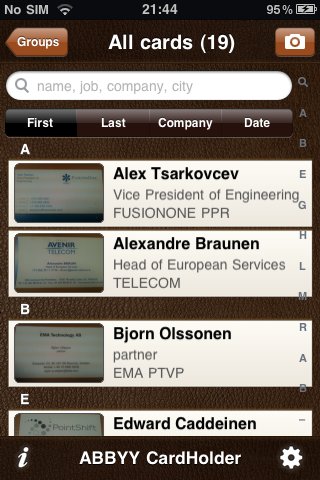 Вышла новая версия электронной визитницы ABBYY CardHolder для iPhoneABBYY CardHolder 1.5 предоставляет базовые возможности по работе с контактной информацией: позволяет позвонить или отправить SMS по указанному на визитке телефонному номеру, направить письмо по электронной почте или перейти по адресу web-сайта. С помощью приложения можно создавать группы контактов, осуществлять сортировку и поиск визитных карточек, архивировать контактную информацию для переноса на другой смартфон или персональный компьютер, отправлять распознанные данные с визитной карточки по SMS или электронной почте. При этом все изображения и контакты хранятся во внутреннем архиве приложения, что помогает не переполнять адресную книгу смартфона и в то же время быстро находить фотографию нужной визитки. ABBYY CardHolder 1.5 базируется на тех же технологиях, что и наделенное более широкими функциональными возможностями приложение ABBYY Business Card Reader. Последнее больше подойдет тем пользователям, у которых регулярно скапливаются десятки визитных карточек. В дополнение к базовым возможностям ABBYY CardHolder 1.5, программа ABBYY Business Card Reader позволяет сохранять информацию из визиток не только во внутреннем архиве приложения, но и в адресной книге смартфона, а также передавать контактные данные напрямую в Salesforce CRM. Кроме того, с помощью ABBYY Business Card Reader можно получить дополнительную информацию о людях или организациях, в которых они работают, на картах Apple или Google Maps, в социальных и деловых сетях Twitter, Facebook и LinkedIn. Доступность и совместимые устройства ABBYY CardHolder 1.5 можно приобрести в магазине приложений Apple AppStore за $0,99. Приложение поддерживает Apple iPhone 3GS / 4 / 4S / 5 с операционной системой iOS 4.2 и выше. Джерело: SmartPhone.ua Обговорення новиниКоментариев пока никто не оставил. Станьте первым! Попередні новини