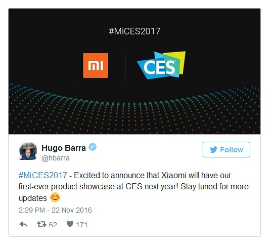 Xiaomi анонсировала презентацию в рамках CES 2017Всемирно известная выставка электроники CES 2017 не за горами, мероприятие пройдет с 5 по 8 января 2017 года в Лас-Вегасе. И участие в мероприятии на днях официально подтвердила компания Xiaomi.