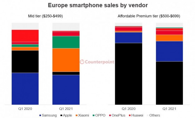 Xiaomi и OPPO ворвались на рынок Европы, лишив Apple продажУдивительные изменения рынка смартфонов за последний год иллюстрирует новое исследование издания Counterpoint Research. Помимо почти полного вылета с рынка Huawei, в средне-ценовом сегменте ($250-500) невероятный всплеск продаж заполучили Xiaomi и OPPO. Так, с мизерных значений первого квартала 2020 года эти компании сумели захватить едва ли не половину всего европейского рынка середняков спустя лишь один год – следует из диаграммы. Причём сильнее всех от такого наплыва китайских гаджетов пострадала Apple, продажи которой в первом квартале 2021 года разительно просели относительно года ранее.