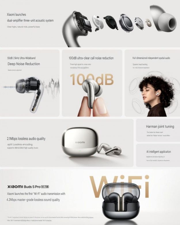 Крім флагманського смартфона Xiaomi 15 Ultra компанія Xiaomi представила сьогодні в Китаї нові флагманські бездротові навушники Buds 5 Pro. Це перші бездротові навушники Xiaomi з підтримкою передачі звуку через Wi-Fi (швидкість до 4,2 Мбіт/с). Новинка також оснащена передовою технологією бездротової передачі звуку aptX Lossless (швидкість до 2,1 Мбіт/с) і підтримкою ШІ-функцій.
