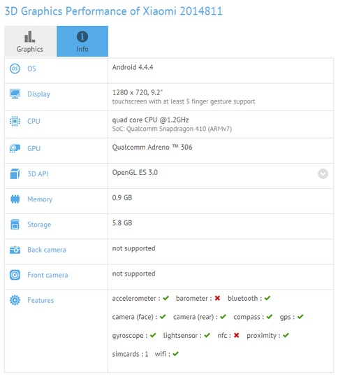 Согласно данным бенчмарка GFXBench, Mipad One получит 9.2-дюймовый дисплей с разрешением 1280x720 пикселей, 64-битный 4-ядерный процессор серии Snapdragon 410 от Qualcomm с тактовой частотой 1.2 ГГц и графикой Adreno 306, 1 ГБ оперативной памяти и 8 ГБ встроенной, а также беспроводные модули Wi-Fi 802.11 b/g/n, Bluetooth 4.0 и GPS. Работать планшет будет на базе операционной системы Android 4.4.4 KitKat.