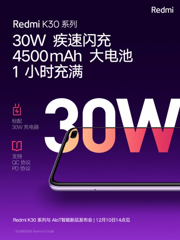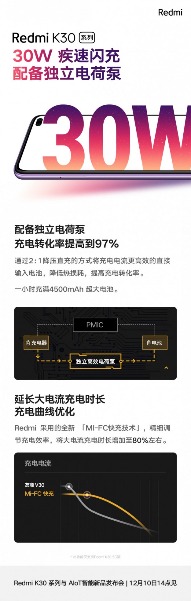 Xiaomi Redmi K30 вновь подтвердил реноме «правильного» Note 8 ProXiaomi продолжает понемногу «сливать» ключевые преимущества Redmi K30, который будет представлен на следующей неделе. На этот раз поговорим о батарее. В социальных сетях компания опубликовала несколько постеров, которыми подтвердила, что питать крепкого 5G-середняка будет источник питания емкостью 4500 мАч, который будет заряжаться 30-Вт быстрой зарядкой. Напомним, такой же аккумулятор получил другой хитовый смартфон бренда – Redmi Note 8 Pro. Вот только у среднебюджетного устройства мощность зарядки «всего» 18 Вт. С учетом подтвержденных данных о Snapdragon 765G и Quad-камере, Redmi K30 вновь подтверждает статус «правильной» версии Redmi Note 8 Pro, которая откроет для поклонников бренда Redmi эру 5G. Официальный анонс пройдет 10 декабря.