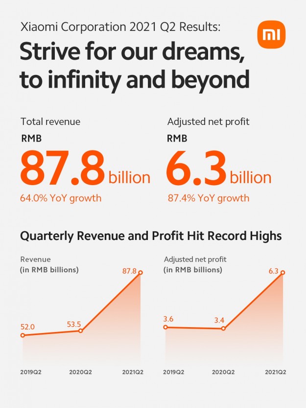 Xiaomi сообщает о существенном росте доходов и прибыли во II квартале 2021 – превышая предварительные оценкиКорпорация Xiaomi (далее – Xiaomi или Группа; код: 1810), интернет-компания, в основе бизнеса которой – смартфоны и потребительская электроника, подключенные к единой платформы интернета вещей (IoT), представила свои консолидированные и подтвержденные аудитом результаты за II квартал, закончившийся 30 июня 2021 года. Во II квартале 2021 года общая выручка и скорректированная чистая прибыль Xiaomi значительно превысили ожидания рынка. Общая выручка за этот период выросла на 64% по сравнению с прошлым годом и составила 87,8 млрд юаней, тогда как скорректированная чистая прибыль за этот период составила 6,3 млрд юаней, что на 87,4% больше, чем в прошлом году.