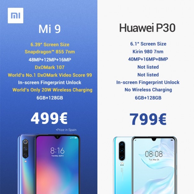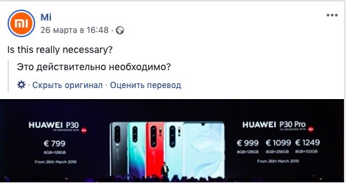 Xiaomi затроллила Huawei сравнением цены Mi 9 и P30Накануне презентации P30 и P30 Pro, Huawei затроллила Apple, назвав ее мероприятие «разогревом перед главным событием». Той же любезностью соотечественникам ответила Xiaomi, но уже после пресс-конференции Huawei. В социальных сетях появились два шутливых поста от Xiaomi. Один из них демонстрирует слайд с ценами на P30 и P30 Pro, риторически вопрошая «А это было обязательно?» (Is this really necessary?). Второй ожидаемо тоже касается цены: инфографика показывает сравнение Xiaomi Mi 9 (499 евро) и Huawei P30 (799 евро).