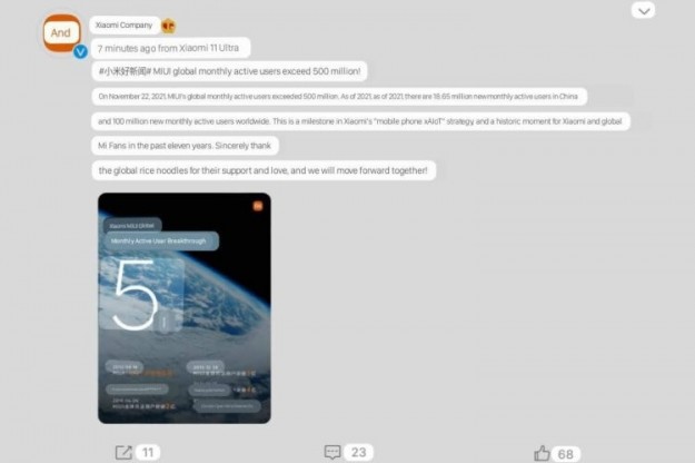 Xiaomi заявила, что около 15 % населения Земли пользуются её смартфонами и планшетамиXiaomi объявила, что по состоянию на 22 ноября 2021 года количество активных пользователей MIUI, фирменной оболочки компании для Android на смартфонах и планшетах, превысило 500 миллионов. Это означает, что около 15 % людей в мире используют смартфоны Xiaomi, Redmi или POCO род управлением MIUI.