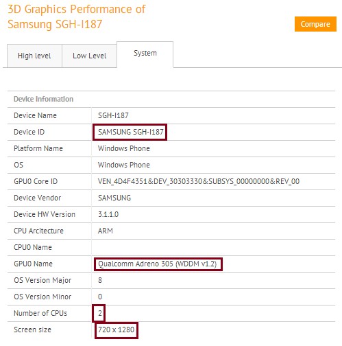 Согласно данным из бенчмарка, девайс оснащен дисплеем с разрешением 720х1280 пикселей, графикой Adreno 305, процессором семейства Snapdragon 400, Snapdragon S4 Play или же S4 Plus от компании Qualcomm. В Benchmark GFX новинка набрала больше баллов, нежели смартфоны HTC Windows Phone 8X и Samsung ATIV S, но меньше, чем Nokia Lumia 920. Буквенный индекс SGH в номере модели говорит о том, что аппарат, вероятнее всего, предназначен для американского оператора сотовой связи AT&T или T-Mobile. Джерело: SmartPhone.ua Обговорення новиниКоментариев пока никто не оставил. Станьте первым! Попередні новини